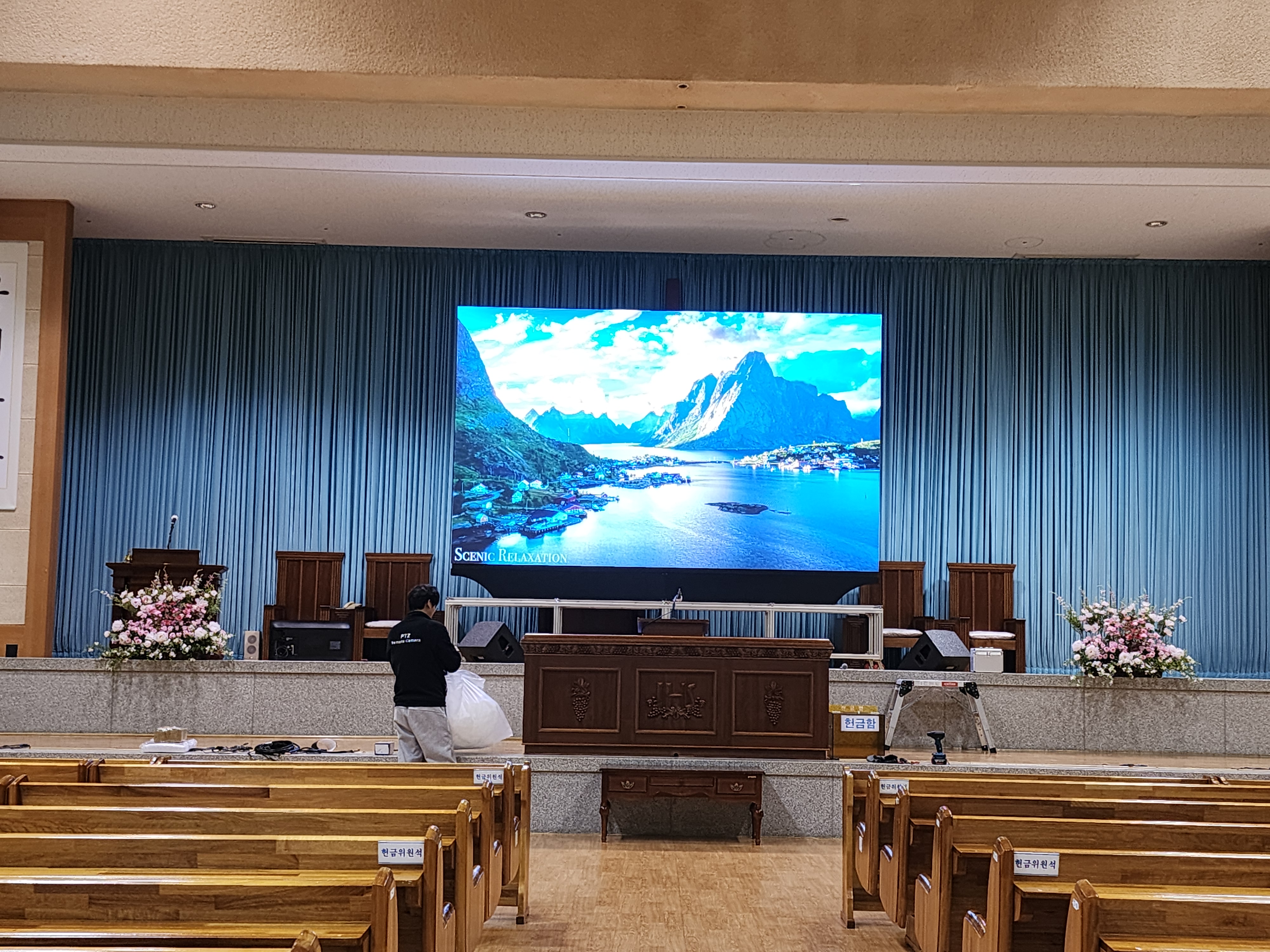이번 현장은 교회 예배당 내부 환경을 고려하여 대형 LED스크린을 설치한 사례입니다.