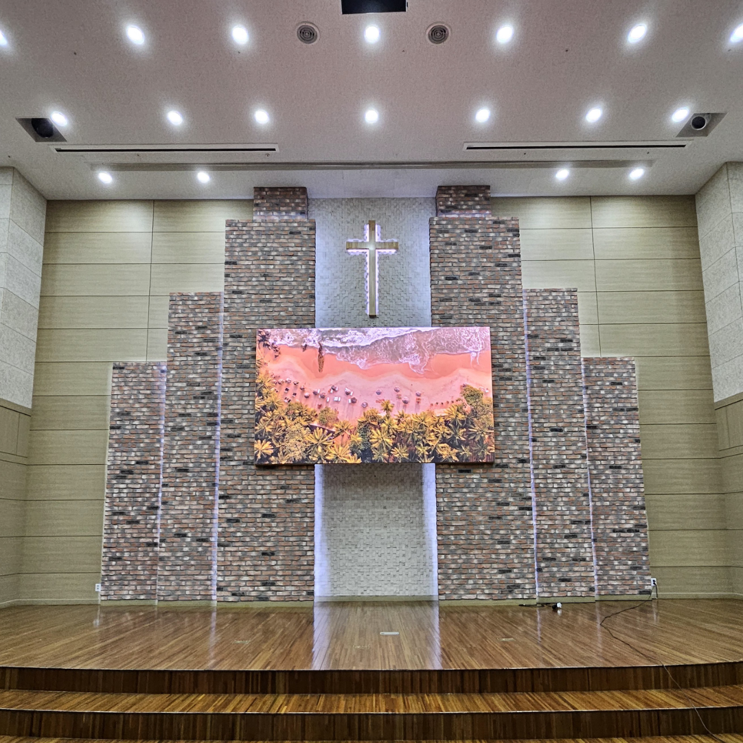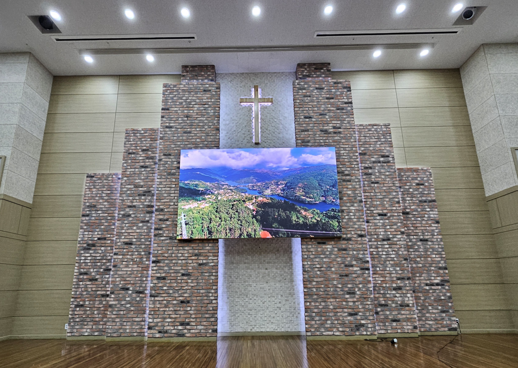 양주 가납교회 본당 강단 전면에 P2.5mm 픽셀피치의 최신형 LED전광판을 설치해