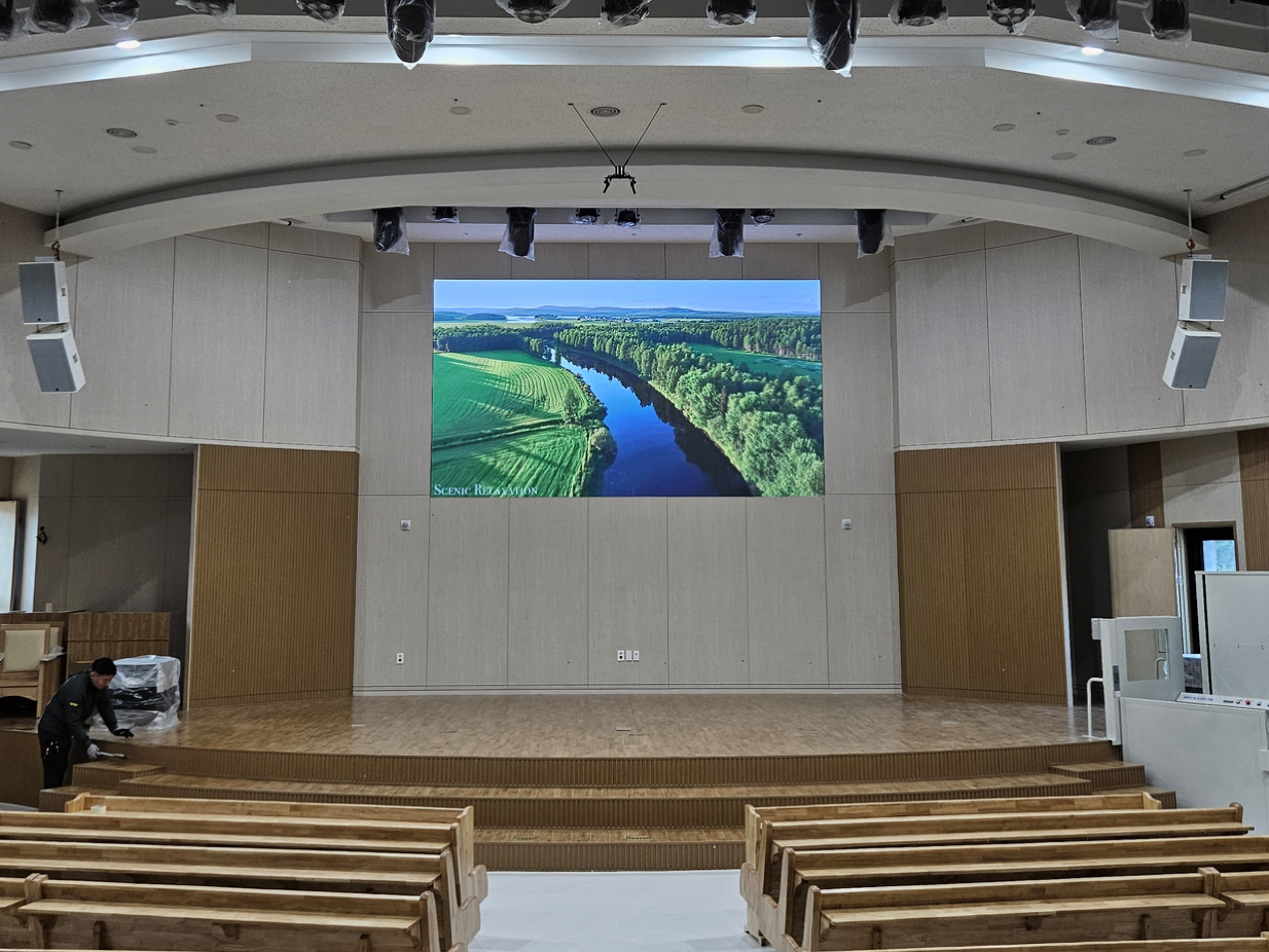 시공을 진행했습니다. 교회 예배 환경에서도 멀리서 또렷하게 화면을 확인할 수 있도록 밝기와 시야각을 고려해