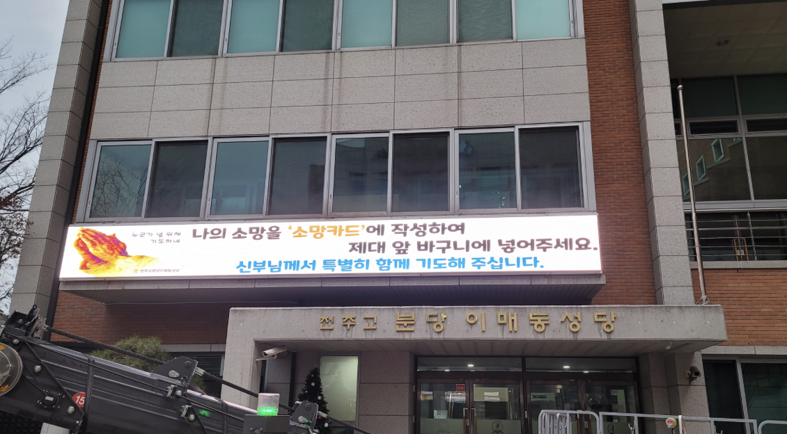 분당 이매동성당 건물 외부 출입구 상단에 전자현수막(LED전광판)을 설치했습니다.