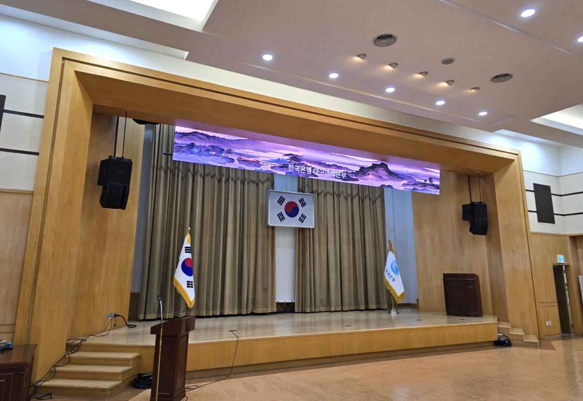 한국은행 대구 경북본부 내부 공간에 전동 엘리베이션 구조의 전자현수막(LED전광판)을 설치했습니다.