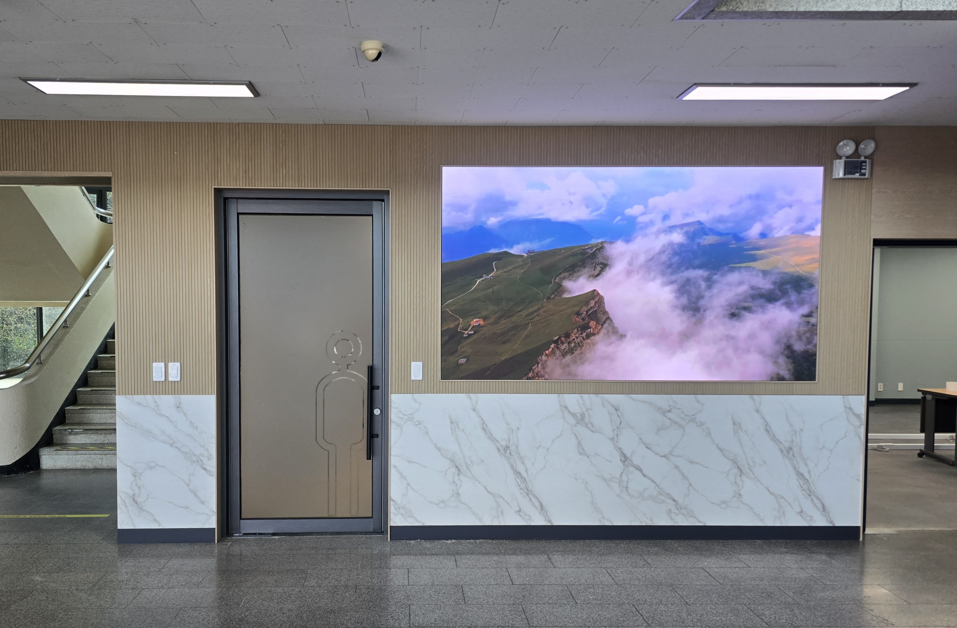 부경대학교 용당캠퍼스 본관 로비 공간에 P1.8mm/ 2560mm x 1440mm LED스크린을 설치했습니다.