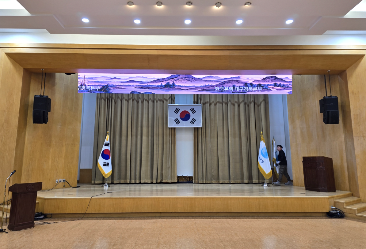 한국은행 대구 경북본부 내부 공간에 전동 엘리베이션 구조의 전자현수막(LED전광판)을 설치했습니다.