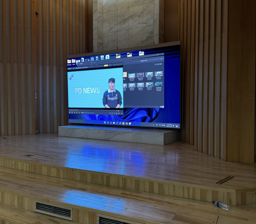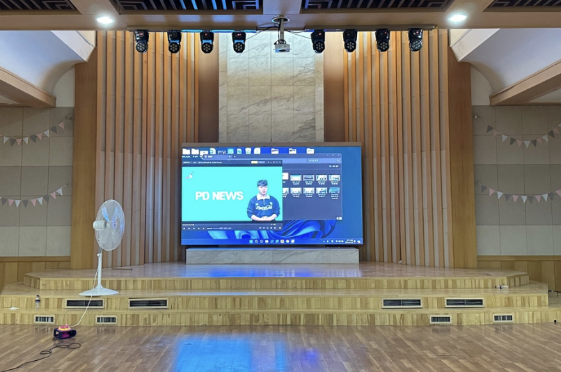한국대학원리연구회 강당 무대 전면에 P2.5mm 전동 엘리베이션 LED스크린을 설치해