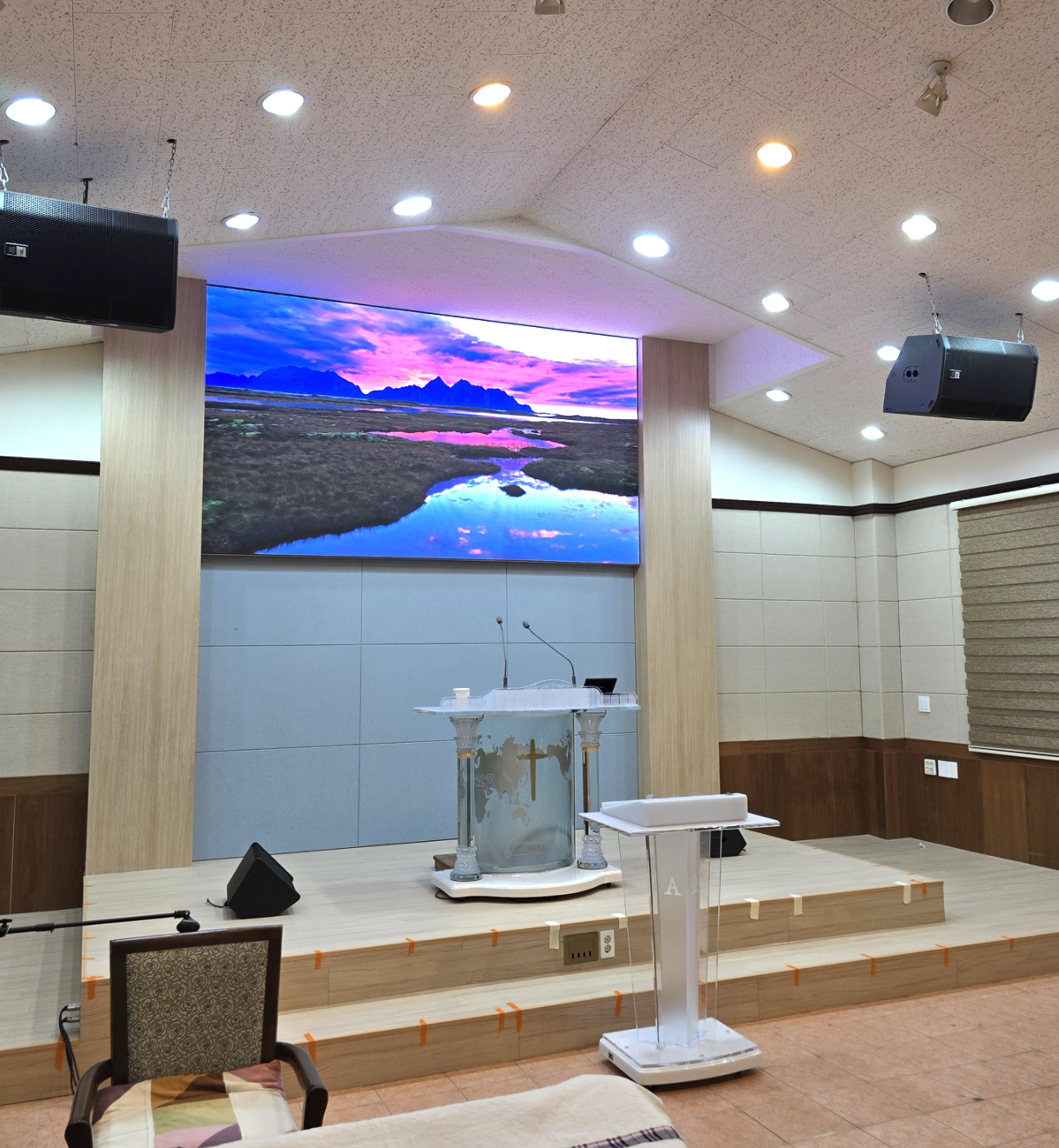 위치 선정과 수평 조절을 진행했으며, 예배 환경에 최적화된 화면 밝기와 컬러 밸런스를 세팅해